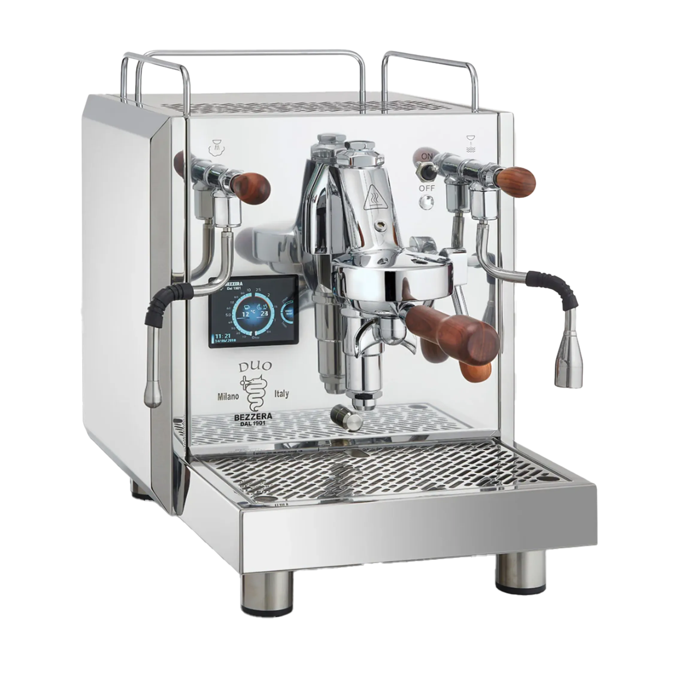 Die Bezzera Duo MN ist eine hochwertige Dualboiler-Siebträgermaschine, die Profitechnik für den Heimgebrauch bietet. Ausgestattet mit einem großen Touch-Screen, ermöglicht sie die Einstellung aller Parameter wie Kesseltemperatur, Preinfusion und mehr.