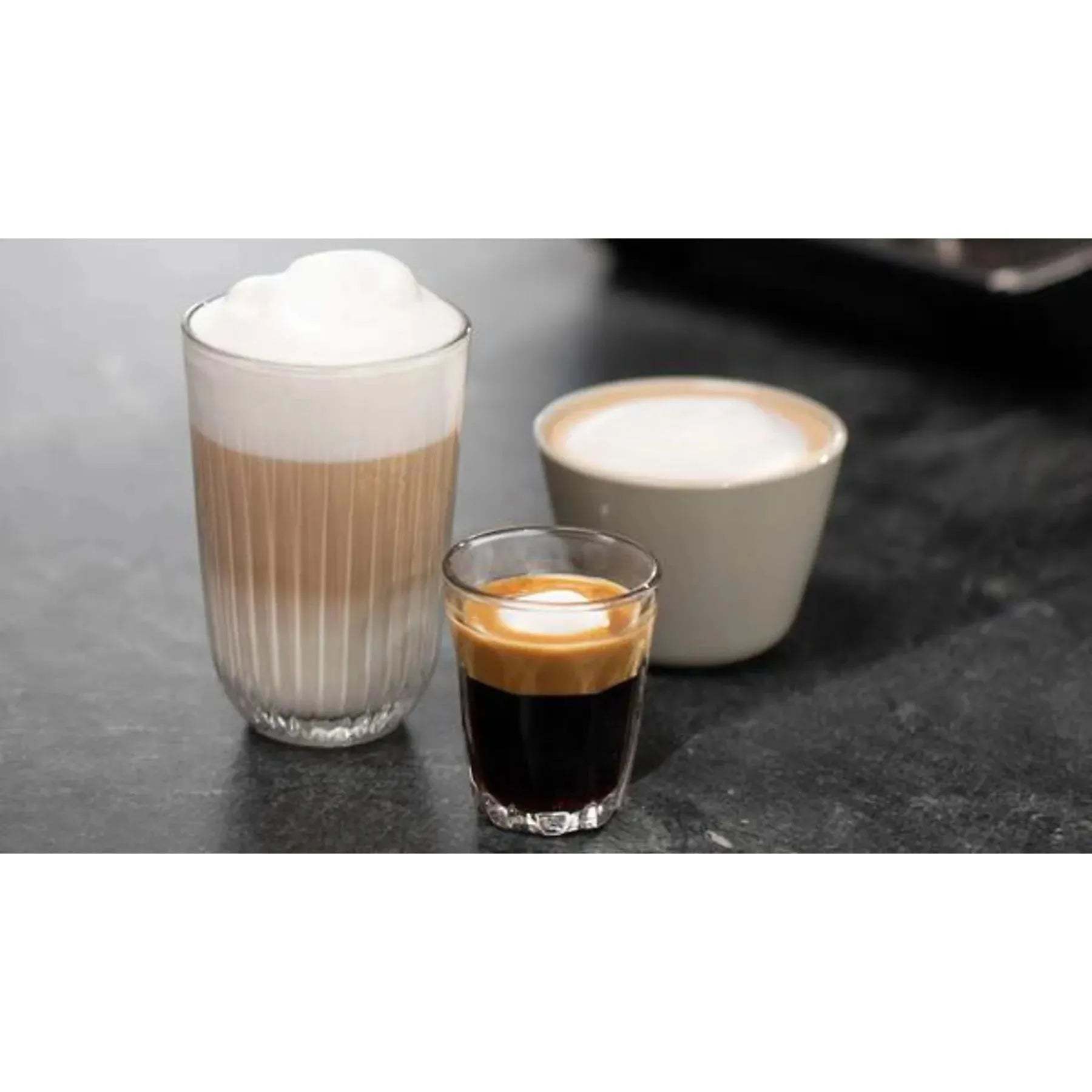 Weitere Highlights sind der beleuchtete Kaffeeauslauf, ein praktischer Tassenvorwärmer und die Kannenfunktion für die Zubereitung ganzer Kaffeekannen. Der integrierte Milchkartonadapter und das 0,7-Liter-Milchsystem bieten zusätzlichen Komfort.